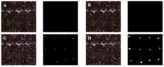 Germination point image of conventional white LEDs treatment acquired through the imaging system during the cultivation period: (A) 17:20 2 days after sowing; (B) 08:40 3 days after sowing; (C) 17:00 3 days after sowing; and (D) 08:20 4 days after sowing.
