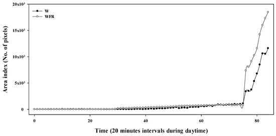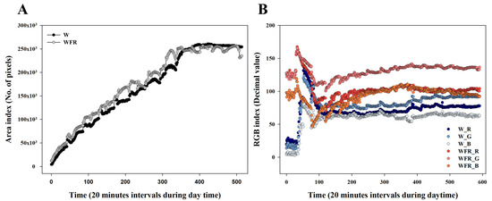 Figure 6 shows the change of area index based on the time of WFR treatment germination. Germination of the WFR treatment occurred first. Furthermore, from the time of 3 days after sowing, the difference in area index between the WFR and W treatment rapidly increased (Figure 6). During the cultivation period, the overall area index was maintained high in the WFR treatment (Figure 7A). However, after the crop image was saturated with leaves, the area index remained almost the same between treatments. Nonetheless, the WFR treatment showed an increase in leaf area in the saturated state. On the other hand, the W treatment showed a slow increase in leaf area in the saturated state. As a result of extracting the RGB color information, the WFR treatment was distributed in the red group as a whole and the W treatment was distributed in the blue group (Figure 7B).