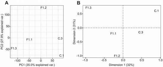Principal component analysis (A) and multidimensional scaling (B) of transcriptome profile displaying differences between tomato fruit exposed to Alternaria chitin oligomers for 30 min (F1.1–3) and control (C1.1 and C1.3).