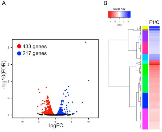 Volcano and heatmap plots depicting the expression profiles of the genes in tomato fruit control (C1 and C3) and exposed with fungal chitin oligomers (F1–F3). ((A): Volcano plot; blue dots: upregulated genes; red dots: downregulated genes. (B): Heatmap plot; red to white to blue indicates the increase in the gene expression).
