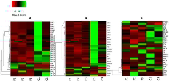 Heatmap displaying the change in the expression profiles of the genes in tomato fruit control (C1 and C3) and exposed with chitin oligomers of Alternaria alternata for 30 min (F1–F3). (A) Genes encoding chitin receptors. (B) Genes involved in signaling. (C) Genes encoding pathogenesis related proteins. (Red to black to green marks the increase in the gene expression).