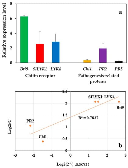 Figure 4a shows the relative expression level from the qRT-PCR of the genes encoding chitin receptors and some pathogenesis-related proteins in tomato fruits exposed to fungal chitin oligomers for 30 min. The qRT-PCR results showed high expression of Bti9 (Solyc01g098420.3, 6.27-fold), whereas SlLYK1 and LYK4 registered similar expression levels (2.57- and 2.85-fold, respectively). The expression results from qRT-PCR and the RNA-seq differential expression data were similar, revealing a high correlation between the two methods. The linear regression analysis showed an R2 value of 0.79 (Figure 4b), indicating a close correlation between transcript abundance as quantified by qRT-PCR and the transcription profile obtained in silico, which supports the precision and robustness of the data and validates the data generated by RNA-seq.