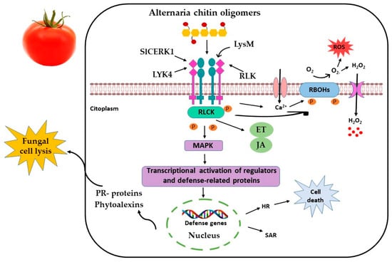 In nature, plants are attacked by various pathogens, especially fungal pathogens. In response, they have developed an “immune system” to defend themselves against fungal attacks. The defense system can be elicited by the pathogen attack or biological compounds, such as chitin and its oligosaccharides, to induce resistance to postharvest diseases. Some studies have demonstrated that chitin increases the resistance to postharvest disease by activating defense mechanisms in fruits. For instance, pear fruits treated with colloidal chitin showed an increase in peroxidase and polyphenol oxidase activities, and a significant reduction in disease caused by Penicillium expansum was observed [6]. In another study, tomato fruits exposed to chitin from Saccharomyces cerevisiae showed a significant increase in the activity of some defense-related enzymes such as glucanase and chitinase, and the rot caused by Botrytis cinerea was significantly reduced [7]. Recently, in previous work performed in our lab, it was observed that tomato fruits exposed for 30 min to chitin oligomers obtained from A. alternata showed a significant increase in the enzymatic activity of the chitinase and glucanase, and also the disease caused by the fungus A. alternata was reduced by 78% [8]. However, in those studies no information is included about how chitin is perceived, or about the molecular mechanism through which the defense response is induced in fruits. Chitin is an amino polysaccharide made up of repeating β-1,4-N-acetyl-glucosamine units and is one of the most abundant polysaccharides in nature. Due to its characteristics, it exhibits biological activity in plants by eliciting the plant immune response in dicotyledons and monocotyledons [9,10]. Scientific evidence indicates that chitin and its oligosaccharides, classified as pathogen-associated molecular patterns (PAMPs), are recognized by pattern recognition receptors (PRRs), which are localized in the plasma membrane. These PRRs coordinate with other associated proteins to initiate signal transduction to the nucleus, leading to PAMP-triggered immunity (PTI) [11].