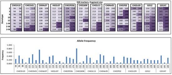 Twelve SSR markers were used, namely GD12, GD147, CH01h10, CH01h01, CH04c07, Hi02c07, CH01f03b, CH02d08, CH02c11, CH04e05, CH01f02, and CH02c09 [20,21,22,23]. These markers are widely applied in apple genotyping and are suggested by the European Cooperative Programme for Plant Genetic Resources (ECPGR) [24]. CH04e05, CH02c11, CH02c09, CH02d08, CH04c07, CH01h01, Hi02c07, and CH01h10 are highlighted as priority group 1 of the ECPGR marker set, whereas CH01f02, CH01f03b, GD12, and GD147 belong to priority group 2. The primer sequences, fluorescent dye, and multiplex group are described in Table A1 (Appendix A).