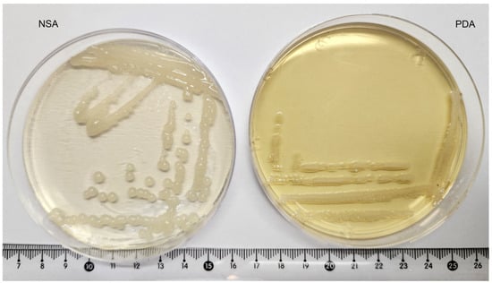 Colony morphology on NSA medium (left) and PDA medium (right) after incubation at 28 °C for 48 h. Off-white, bead-like formations on NSA medium are characteristic of E. amylovora.