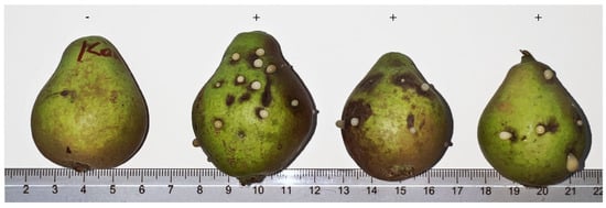 Because ooze exuded from infected plant tissue is the primary method of dispersal for E. amylovora in vivo [37], it was chosen as the inoculant. To obtain the ooze, five pear fruits of a local susceptible cultivar, “Lesnaya krasavitsa”, were injected with the same E. amylovora cell suspension, with one pear left out as a negative control (LB medium) (Figure 4). Six days after inoculation, points of injection started excreting opaque ooze, which was then used for the inoculation of apple plantlets.