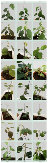 Inoculation was conducted through a series of stem incisions via a sterile scalpel dipped into the ooze; the location of the incision was wrapped in paraffin film to create an anoxygenic environment for bacteria growth. Eight 5-month-old apple tree saplings were inoculated on 30 June 2021. Phenotypic fire blight responses of the regenerants were evaluated under glasshouse conditions and scored using a categorical scale of severity of infection (0 to 5) [32,33]: