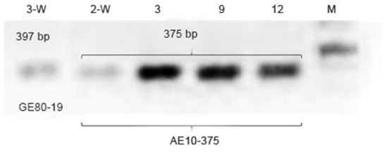 The resistant alleles of markers AE10-375 and GE80-19 are characterized by amplicons of 375 bp and 397 bp, respectively [13,14]. Seven genotypes tested positive for AE10-375 (Table 2), and only the 3-W genotype from the wild forest in the Tscherkesay Canyon amplified GE80-19 (Figure 6). The plants amplifying both markers had been previously characterized with higher resistance to the pathogen compared with the genotypes bearing only the resistance allele for one of the two markers [14].