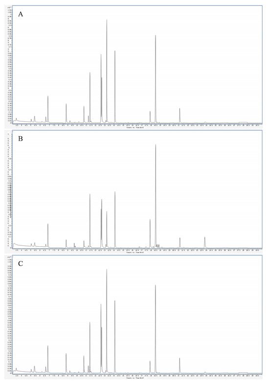 Total ion flow diagram for QC sample nature spectrum analysis. Note: (A, B, and C) are total ion flow diagrams for ‘Fengtang’ plum, ‘Kongxin’ plum, and ‘Cuihong’ plum, respectively.