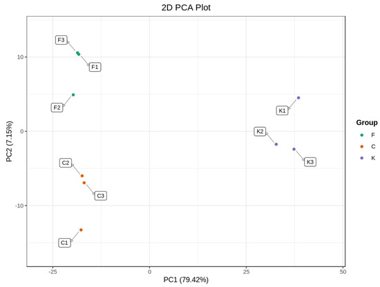 PCA analysis is a statistical method to examine the correlation between multiple variables, retaining the original data as much as possible to reflect the information of the data more intuitively and simply [28]. As can be seen from Figure 2, the contribution of PC1 was 79.42% and the contribution of PC2 was 7.15%, with a cumulative contribution of 86.57%; thus, the overall information is reflected well. The groups of plum fruit samples were clustered together internally, with a clear trend of separation between different varieties, which generally reflected the volatile differences between different varieties of plum fruits and the PCA results. In addition, with the ‘Fengtang’ plum and ‘Cuihong’ plum on one side and the ‘Kongxin’ plum on the other side, they were basically effectively differentiated, indicating that the volatile compounds of the fruits of the ‘Fengtang’ plum and ‘Cuihong’ plum differed less in terms of type and relative content, whereas the differences were greater with the ‘Kongxin’ plum, suggesting that they had significantly different flavors [29].