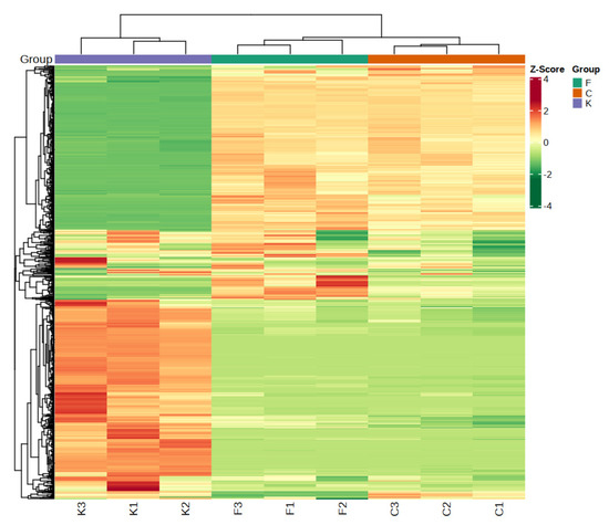 Cluster analysis is a method for describing differences between varieties; a certain degree of homogeneity in plum fruits with similar volatile characteristics is reflected, while different clusters reflect different similarities [30]. The clustering analysis enabled the substances with high similarity in different samples to be clustered together and the differences between samples to be visualized [31]. From the clustering results, Figure 3 shows that the clustering dendrogram of the volatile compounds of the different plum varieties shows two main categories, in which the samples of the ‘Fengtang’ plum and ‘Cuihong’ plum were grouped; the samples of the ‘Kongxin’ plum were in the other category, which indicated that the volatile compounds of the ‘Fengtang’ plum and ‘Cuihong’ plum were highly similar, while they were different from those of the ‘Kongxin’ plum; this corresponds to the PCA results, which showed differences in volatile composition among the fruit samples of the different varieties [32].