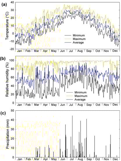 Meteorological data for 2022 for the experimental field trial of the Apple Research Institute in Gunwi South Korea. Change in (a) daily temperature, (b) daily relative humidity (rainfall), and (c) daily precipitation.