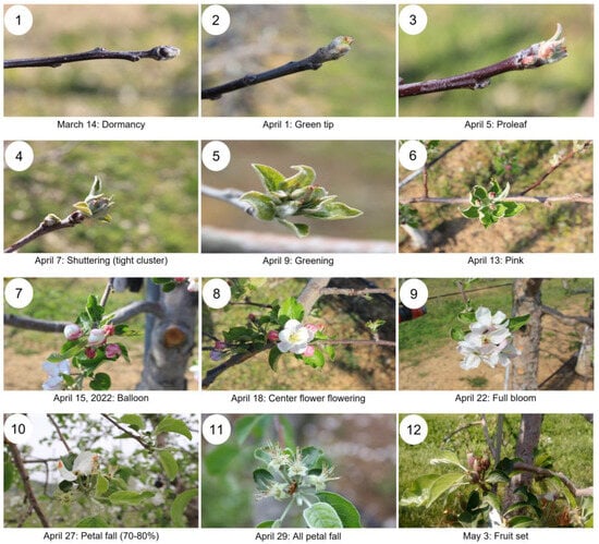 Phenological changes of the flower according to the development stages of the ‘Enbu’ apple in 2022. The 1st day of full bloom was recorded on 22 April, when the ‘Enbu’ apple was 70–80% bloomed. (1) Domancy; (2) Germination period: the tip of a green leaf containing a berry inside is visible; (3) Proleaf stage: the stage when the flower shoots spread out, and the green leaves have grown up to 10mm in scale; (4) Shuttering: flower buds are formed; (5) Greening stage: the period when flower buds are covered with calyx pieces and turn green. (6) Pink: the petals are exposed outside the calyx and turn pink, and the petals are observed; (7) Balloon stage: the period when the petals grow and become balloon-shaped; (8) Center flower flowering: the first flower (center flower) blooms; (9) Full bloom: 70–80% bloomed; (10) Petal fall (falling flower): 70–80% of the flowers have fallen; (11) Flowers have fallen: all petals have fallen; (12) Fruit set: the size of the fruit is 10mm in diameter.