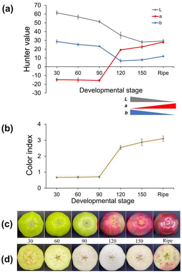 Skin color properties and development were measured during different fruit developmental stages (Figure 4). The color patterns of the fruits were evaluated using Hunter values (L, a, and b) (Figure 4a) and expressed as the color index (Figure 4b). The a value exhibited a positive correlation with the degree of fruit coloration, whereas the L and b values showed a negative correlation with the level of fruit coloration. At the early developmental stages (30–90 DAFB), fruit coloration was green, with a negative a value and high L and b values (Figure 4a). Subsequently, the fruit quickly turned red, especially during 90–120 DAFB (Figure 4c). At the late fruit developmental stage (120–150 DAFB) and ripening stage, the fruit skin color intensity increased and reached the highest levels at the ripening stage. Apparent differences in coloration patterns in the later stages correlated with skin color properties. When the fruit color turned red at 90–120 DAFB, the a value (denoted by red) increased from a negative value (−15.66 at 90 DAFB) to a positive value (19.20 at 120 DAFB). Additionally, L and b changed from a high value to a low value; that is, they decreased from 51.37 to 35.86 and 23.28 to 6.61, respectively, and remained relatively stable during the late stages of fruit development (120–150 DAFB and the ripe stage), as the apparent coloration patterns changed only slightly. Regarding the Hunter value, the color index showed a similar trend, with a positive correlation with the red coloration level (a value) and a negative correlation with L and b values. At the early fruit development stages, the color index value was low (0.67–0.70) for 30–90 DAFB; subsequently, the color index showed a higher value (2.87) at 120 DAFB, when the fruit skin turned red. The color index value slowly increased and reached the highest value (3.09) during the ripening stage (Figure 4b). In general, the coloration levels of the fruit skin changed across developmental stages, in correlation with changes in the Hunter value and color index. Furthermore, in addition to the coloration patterns of the skin, we observed changes in the flesh of the fruit during fruit development (Figure 4d). Interestingly, unlike the skin, the fruit flesh showed a different coloration pattern. The skin of the fruit turned red at 90 DAFB, whereas the fruit flesh was still white until the late developmental stage (150 DAFB), and finally, it turned red at the ripening stage. Furthermore, the apparent coloration patterns differed between the fruit skin and flesh.