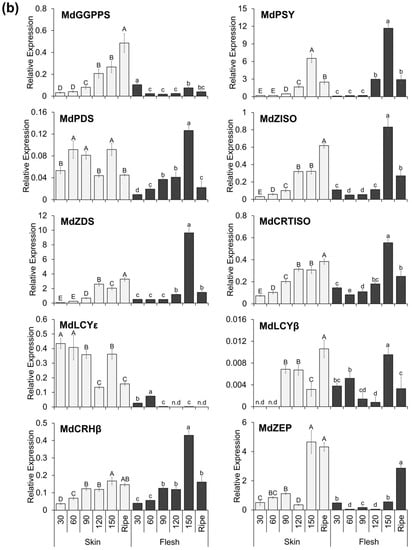 (a) Carotenoid biosynthesis pathway. (b) Relative expression profiles of carotenoid biosynthesis genes according to developmental stages in the skin and flesh tissues of ‘Enbu’ apples. MdGGPPS, geranylgeranyl pyrophosphate synthase; MdPSY, phytoene synthase; MdPDS, phytoene desaturase; MdZISO, zeta-carotene isomerase; MdZDS, zeta-carotene desaturase; MdCRTISO, carotenoid prolycopene isomerase; MdLCYε, epsilon lycopene cyclase; MdLCYβ, lycopene beta cyclase; MdCRHβ, beta-carotene hydroxylase 2; and MdZEP, zeaxanthin epoxidase. qRT-PCR assays were conducted in three biological replications. Transcript levels were calculated in normalization to an apple SGF 29 tudor-like domain-containing protein (MDP0000336547) gene. Data are expressed as mean ± SD. Different uppercase letters denote a significant difference (p < 0.05) in the skin, and different lowercase letters denote a significant difference (p < 0.05) in the flesh. n.d refers to non-detectable.
