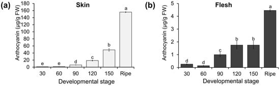 Accumulation of anthocyanin in the skin (a) and flesh (b) of ‘Enbu’ apples at different fruit development stages. Data are expressed as the mean ± SD (n = 3). Different letters represent a significant difference (p < 0.05).