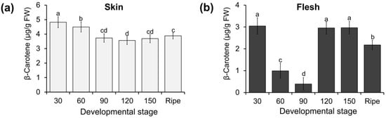 The accumulation of β-carotene during fruit development is shown in Figure 8. In the skin tissues, β-carotene contents were the highest at the early stages of fruit development (30 DAFB), decreased (60–120 DAFB), and then increased again at the late stages (150 DAFB to the ripe stage) (Figure 8a). In the flesh tissues, the accumulation of β-carotene was high in the early stages (30 DAFB). Subsequently, β-carotene concentration declined (60–90 DAFB), accumulated the same amount at 120 and 150 DAFB, and then slightly dropped at the ripe stage (Figure 8b).