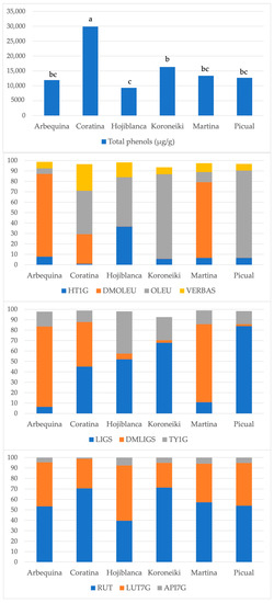 Total phenol content [different letters indicate significant differences (p < 0.001) between genotypes] and distribution of individual components within main groups according to genotypes. HT1G: Hydroxytyrosol-1-O-glucoside, OLEU: Oleuropein, DMOLEU: Demethyloleuropein, VERBAS: Verbascoside, LIGS: Ligstroside, DMLIGS: Demethylligstroside, TY1G: Tyrosol-1-O-glucoside, RUT: Rutin, LUT7G: Luteolin-7-O-glucoside, API7G: Apigenin-7-O-glucoside.