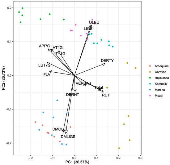 The distribution of samples on the PCA biplot supports the results of the analysis of variance, highlighting the dominant impact of genotype in elucidating the observed variability. In the PCA analysis, oleuropein and ligstroside were positioned in the first quadrant together with the ‘Koroneiki’ and ‘Picual’ cultivars. Similar results obtained for the cultivar ‘Picual’ in previous studies [4,5,8]. ‘Hojiblanca’ was located away from the other genotypes in the second quadrant along with apigenin-7-O-glucoside, hydroxytyrosol-1-O-glucoside, tyrosol-1-O-glucoside, luteolin-7-O-glucoside, and the total value of the flavones group. On the other hand, the ‘Arbequina’ and ‘Martina’ cultivars exhibited a clear separation from the other genotypes and were positioned in the third quadrant along with demethyloleuropein and demethylligstroside. Previously, it has been reported that ‘Sikitita’ [23] and other breeding selections [8], all of them derived from the ‘Picual’ × ’Arbequina’ cross, were classified together with its parent variety ‘Arbequina’ in the PCA analysis. Finally, ‘Coratina’ was positioned in the fourth quadrant along with rutin, verbascoside, and total phenol components.