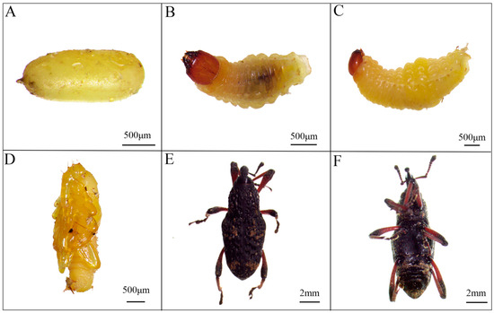 The larvae were soft, 9.84 ± 2.14 mm in length, roughly rounded and curved, with a distinctive depression in the middle of the cranial suture, reduced antenna size, no caudal whiskers, and reduced thoracic legs, typical of weevil larvae (Figure 2B). When the larvae molted, the epidermis of the head splits opened first, and the molted skin was gradually pushed downwards, finally falling off from the end of the abdomen, with the newly molted larvae in a lighter color that gradually deepened (Figure 2C).