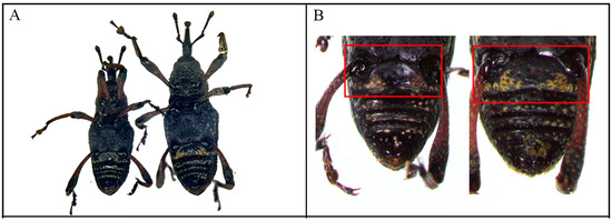 - Whitehead, D.R.; Chamorro, M.L.; Anderson, R.S. An Illustrated Key to the Species of Curculio Linnaeus (Coleoptera: Curculionidae) of North America East of the Mississippi River. Proc. Entomol. Soc. Wash. 2018, 120, 616–641. [Google Scholar] [CrossRef]