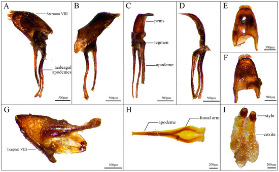 Morphological characteristics of the external genitalia of adults of Nassophasis sp. (A) Sternum Ⅷ and Ⅸ (ventral view). (B) Sternum Ⅷ and Ⅸ (lateral view). (C) Male genitalia (ventral view). (D) Male genitalia (lateral view). (E) Sternum Ⅷ (dorsal view). (F) Sternum Ⅷ (ventral view). (G) Female genitalia. (H) Stemum. (I) Coxite.