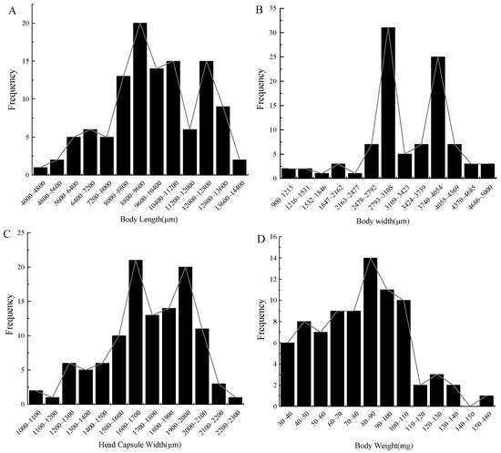 The head capsule width, body length, and body width of 133 larvae were measured under an Olympus-szx7 stereomicroscope (Figure 1), and body weight was measured using an electronic balance. Histograms of frequency distributions were plotted using Origin 2021 [15].