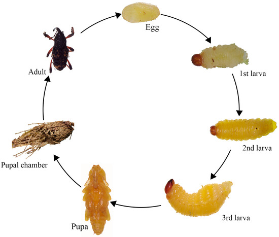 In 2019, our group found a species of weevil that caused extensive hollowing and wilting death of Dendrobium during a pest survey of a dendrobium plantation in Qiandongnan Prefecture; it was morphologically identified as Nassophasis sp. There are limited reports of Nassophasis sp., such as its external morphology [9], host selection, and feeding behavior [10,11,12]. The life cycle, occurrence pattern, and biological characteristics of this weevil, as well as the cause of its widespread local occurrence in Guizhou, are currently unknown, which limits plant protection efforts of the dendrobium cultivation industry.