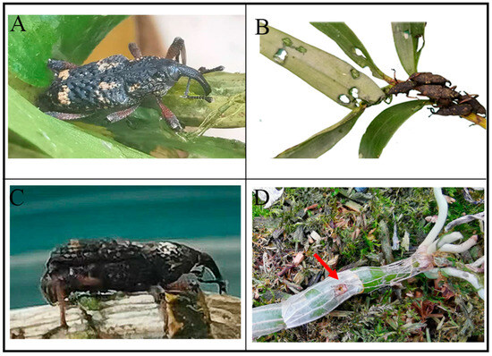 Dendrobium is a perennial epiphytic herb of the Orchidaceae family, mainly distributed in Asia, New Guinea, and Australia, with important ornamental, medicinal, and economic values [1]. The whole plant of Dendrobium can be used as a medicine. Because the plant is rich in dendrobium polysaccharides, Dendrobium alkaloids, amino acids, and other nutrients, it is now commonly used in the development and utilization of functional drugs, tea substitutes, and health care products, such as lowering blood sugar, inhibiting tumors, and improving human immunity [2]. To satisfy the market demand, the artificial cultivation of the plant has developed rapidly. The planting mode is mainly based on shed cultivation, attached tree cultivation, and attached stone cultivation [1]. With the frequent sales of dendrobium seedlings between provinces and the increase in planting density within local areas, the plant also faces the risk of pests spreading damage over long distances and at large scales. In particular, the occurrence of pests such as stem-boring (many kinds of weevils) and leaf-eating species (moths and slugs) is becoming severe [3,4]. Among these, weevils are characterized by high concealment, untimely identification, and difficulty in control, and often have already caused severe damage to the plants when discovered [5,6]. Currently, the main focus is on manual removal, control by parasitic or predatory natural enemies, and chemical control [7,8], which seriously affects the production and quality of plants. These factors restrict the development of dendrobium industries such as processing and utilization.