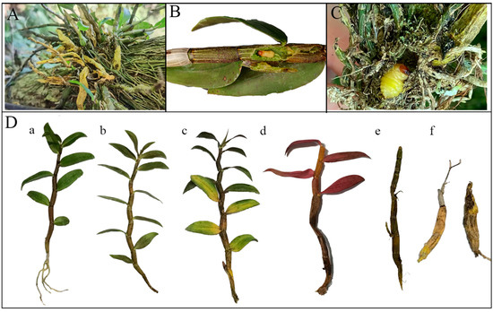 Damage symptoms of Nassophasis sp. larva. (A) Complete drying of dendrobium in an advanced stage of infestation. (B) Larvae infesting stems. (C) Pupal chamber of the mature larva. (D) Dendrobium stems with different levels of larval infestation: (a) healthy stem and (b–f) damaged stem.
