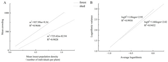 Linear regression models of the spatial distribution of Nassophasis sp. under different planting patterns. (A) Iwao m*-m regression equation. (B) Taylor’s power law.