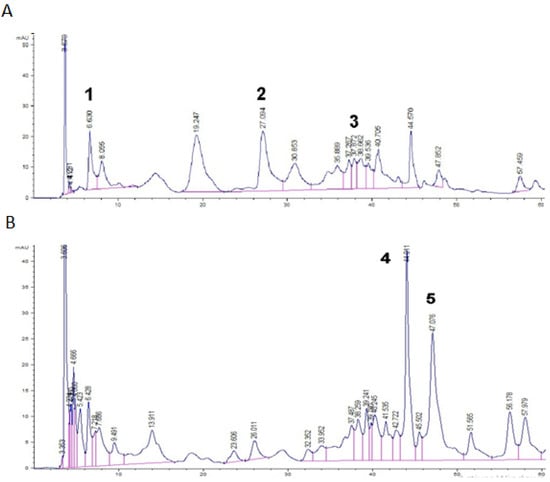 HPLC chromatograms of Carya illinoinensis recorded at 280 nm (A) and 260 nm (B). Peak identification: (1) gallic acid; (2) catechin; (3) epicatechin; (4) ellagic acid derivative; and (5) ellagic acid.