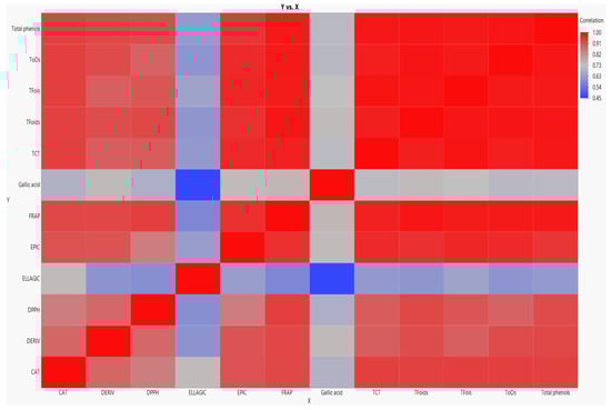 Heat map of Pearson’s correlation coefficient among phenolics and DPPH and FRAP assays. Gradient color barcodes at the right indicate the minimum value in blue and the maximum in red.