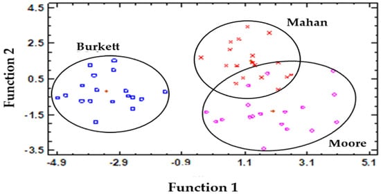 Therefore, the biochemical parameters assayed in this study could be used to distinguish Burkett, Mahan, and Moore cultivars. Overall, the CDA effectively separated Burkett from the other cultivars, based on the measured variables of the present trial.