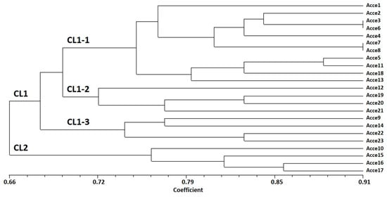 Cluster analysis revealed that the 23 accessions were assorted into two major groups (Figure 2). Cluster I (CL1) was the largest, comprising the 19 accessions of landraces collected from local farmers in South Tunisia. The second cluster (CL2) was formed by the four pre-breeding lines selected during several years at the CRRHAB and which have an exotic origin.