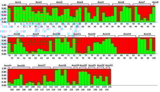Population structure of 135 onion individuals (belonging to 23 accessions). The corresponding membership probability is presented on the vertical axis. Vertical bars represent each individual analyzed in this study. Red color is allocated to population 1 and green color is allocated to population 2.