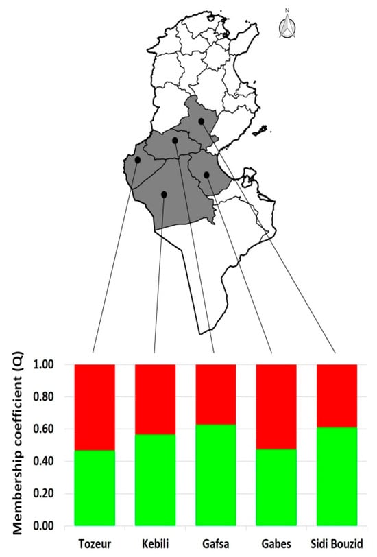 The 19 collected Tunisian onion landraces were divided into five groups according to the sampling locations (Tozeur, Kebili, Gafsa, Gabes, and Sidi Bouzid) (Figure 5). For each group, the mean of the membership coefficient (Q) of the two subpopulations, detected by structure analysis, was calculated. Subpopulation 1 (in green) was more abundant in onion samples collected in Gafsa, Sidi Bouzid (both > 60%), and Kebili (nearly 60%). The genetic structure of the samples collected in the Tozeur and Gabes locations is almost equally distributed between the two subpopulations.