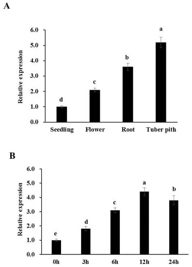 Total RNA from potato seedlings was extracted using TRIzol reagent (Invitrogen, Carlsbad, CA, USA). Then, a reverse transcriptase kit (Thermo, Tokyo, Japan) was used to create cDNA. qRT-PCR experiments were conducted using a 7500 Real Time PCR System (Bio-Rad, Hercules, CA, USA). The elongation factor gene in potato was used as an internal control, and the formula 2−ΔΔCt was used to calculate gene expression level.