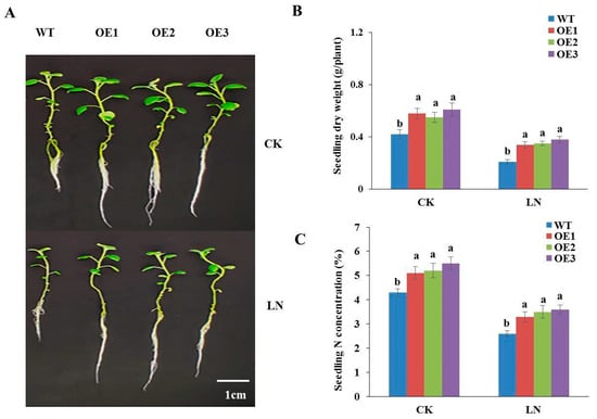 Plant growth and dry weight analysis of the wild type and transgenic lines. (A) Seedlings of the WT and the transgenic lines (OE1, OE2, and OE3) grown under N-sufficient conditions and LN conditions. (B) Dry weight of seedlings. (C) N concentration of seedlings. Different lowercase letters represent a significant difference at p < 0.05.