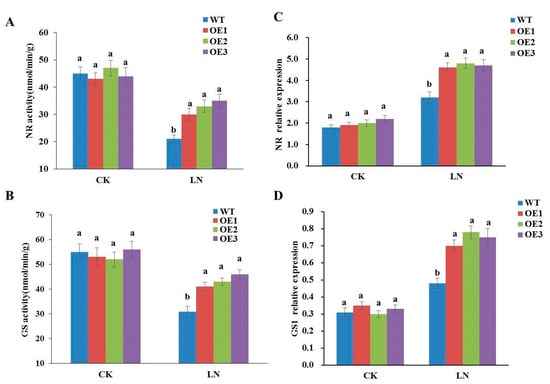Analysis of enzyme activity and expression level of the transgenic lines. (A) NR activity of seedlings; (B) GS activity of seedlings; (C) NR expression level in seedlings; (D) GS expression level in seedlings. WT means wild type, OE1–OE3 means the transgenic lines. The data are the means ± SEs of three replicates. Different lowercase letters represent a significant difference at p < 0.05.