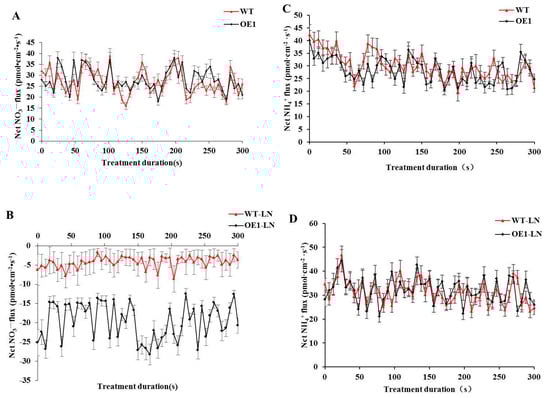 NO3− and NH4+ fluxes of potato roots under different N concentration treatments. (A) NO3− flux under N-sufficient conditions; (B) NO3− flux under LN conditions; (C) NH4+ flux under N−sufficient conditions; (D) NH4+ flux under LN conditions. A positive value indicates efflux, a negative value indicates influx. WT means wild type; OE1 means the transgenic lines.