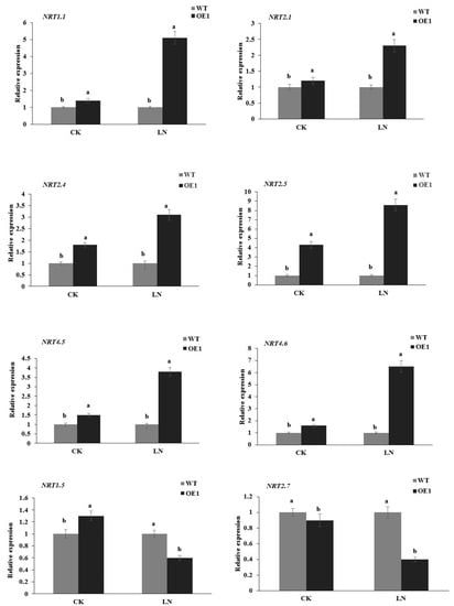 Expression analysis of nitrate transporters in transgenic plants. WT means wild type; OE1 means the transgenic lines. Different lowercase letters represent a significant difference at p < 0.05.
