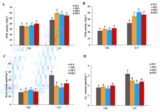 To study the effect of overexpressing StGAPC1 on the ROS system under LN stress, first, the seedlings of the WT and transgenic potato lines OE1, OE2, and OE3 were cultured in nutrient solution (N-sufficient conditions and LN conditions) for 15 days. Then, we measured the POD activity, SOD activity, and H2O2 and O2− contents. The results suggested that overexpressing StGAPC1 significantly increased the activity of SOD and POD (Figure 6A,B). On the other hand, the contents of both H2O2 and O2− in the transgenic lines were also decreased compared to those in the WT (Figure 6C,D). All the results demonstrated that overexpressing StGAPC1 increases antioxidant enzyme activity to reduce H2O2 and O2− accumulation under LN stress.