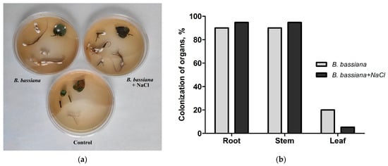 Colonization of S. tuberosum organs by B. bassiana. Plants were grown in a nutrient medium (0.5 MS) supplemented with both entomopathogenic fungus B. bassiana conidia (strain Sar-31, final concentration in the medium: 1 × 106 spores/mL) and salt (NaCl, 100 mM). (a) Fungal reisolation from sterilized plant organs (roots, stems, and leaves) in the Sabouraud modified medium; (b) the percentage of plant organs colonized by the fungus. The colonization was estimated on 20 plants in each treatment group (each plant was a biological replicate). The two groups inoculated with B. bassiana did not significantly differ in the extent of the plants’ organ colonization (χ2 ≥ 0.34, df = 1, p ≤ 0.58).
