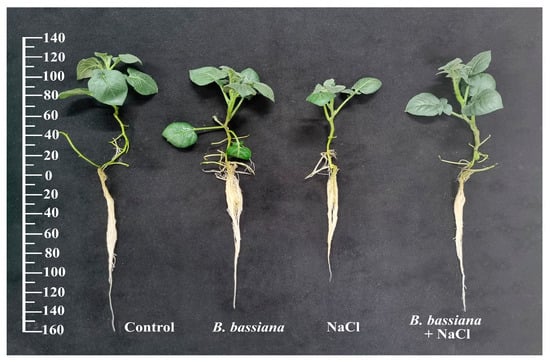 S. tuberosum plants grown in a nutrient medium (0.5 MS) with the addition of entomopathogenic fungus B. bassiana Sar-31 conidia (106 spores/mL) and/or salt (NaCl; 100 mM). Exposure duration: the fungus, 7 days; salt, 5 days. The scale bar is presented in millimeters.