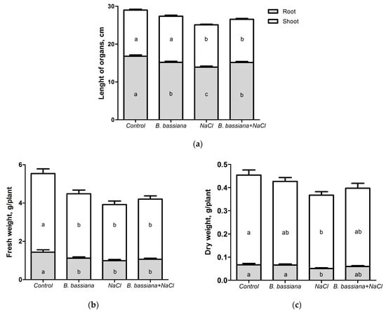 Effects of inoculation with B. bassiana and/or of salt on plant growth: length (a) and fresh (b) and dry (c) weights. Values are the mean ± SE. Identical letters within a row indicate insignificant differences between treatment groups (two-way ANOVA, Fisher LSD test, p > 0.05).