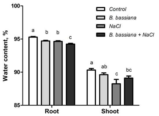 The 1-week cultivation of the potato plants both with the fungus conidia and salt affected several parameters of potato plant growth (Figure 2 and Figure 3). The strongest inhibition of growth characteristics was noted in the group treated with NaCl alone. Plants colonized by the fungus were more tolerant to the salt stress. This finding was clearly evidenced by such parameters as the length of the roots and the dry weight of plants (Figure 3a,c). Under salinity stress, the length of the roots was significantly smaller in comparison to the combined treatment with B. bassiana and salt (p = 0.003, Figure 3a). Inoculation with the conidia of B. bassiana did not significantly influence the dry weight of the aboveground and underground plant organs in comparison to that of the control (p = 0.08), whereas the application of salt alone caused it to decrease in comparison with the control and fungus treatment groups, respectively (p ≤ 0.017; Figure 3c). At the same time, in all treatment groups, the fresh weight of the aboveground and underground plants’ organs was significantly lower in comparison with that of the control (p ≤ 0.019; Figure 3b). A statistically significant decrease in water content was noted in the shoots and roots under the influence of salt (F1,122 ≥ 9.30, p ≤ 0.003) as well as in the roots under the influence of B. bassiana (F1,122 = 20.00, p < 0.001, Figure 4), which was most likely the cause of the equalization of the dry weight between the control and inoculated plants.