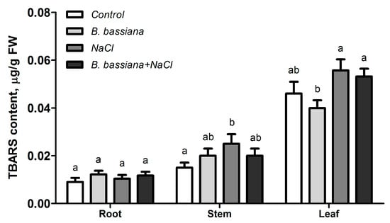 Effects of inoculation with B. bassiana and/or of salt on the TBARS content in plant organs. Twenty plants were used in each treatment group. Presented values are means ± SE. Identical letters denote insignificant differences between treatment groups within each organ (two-way ANOVA, Fisher LSD test, p > 0.05).