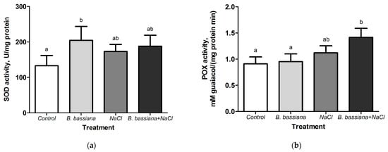 Effects of inoculation with B. bassiana and/or of salt on the activity of antioxidant enzymes in the leaves of S. tuberosum. (a) SOD activity; and (b) POX activity. Twenty plants were subjected to each treatment. Identical letters indicate insignificant differences between treatment groups (two-way ANOVA, Fisher LSD test, p > 0.05).