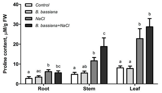 Effects of inoculation with B. bassiana and/or of salt on the free-proline content of plant organs. Twenty plants were subjected to each treatment. Identical letters denote insignificant differences between treatment groups within each organ (two-way ANOVA, Fisher LSD test, p > 0.05).